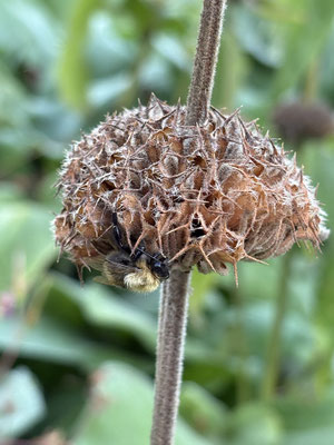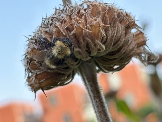 Wat ik een mooi detail vind: als je inzoomt zie je dat de poten van de hommel ook stekelig/behaard zijn, nét zoals de plant zelf.